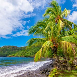 Description impressionnante de leur quête du « retour à la nature » sur cette île du bout du monde par Thor Heyerdahl et sa femme dans son livre « Fatu Hiva ». Pour ceux qui s’en sentent l’envie et la force, un tour à pied de l’île en 17 km en permet la découverte (pour randonneurs habituels, voire confirmés). Les canots vous amènent à terre dans la baie d’Omoa. Cet endroit reste le seul aux Marquises où les habitants fabriquent encore le « tapa » traditionnel, à base d’écorce. Vous assisterez à la fabrication du »tapa« et de l’odorant bouquet de fleurs « Umu Heié » sur un grand marché artisanal. Des artisans vendent des tapas peints, des sculptures sur bois et des paréos colorés. A proximité du marché se trouve le musée de la famille Grellet, consacré aux objets d’art et aux ustensiles artisanaux marquisiens. Les randonneurs prennent la direction de Hanavave, les autres bénéficient de temps libre au village. Retour à bord et déjeuner tardif. Un pique-nique est prévu pour les randonneurs en cours de route. Après le déchargement et l’embarquement du fret, l’ARANUI poursuit sa route vers Hanavave. Débarquement en canots. Un marché artisanal vous attend à Hanavave avec des sculptures sur bois. Les femmes du village vous offriront des gâteaux faits maison. En compagnie des randonneurs qui nous auront rejoints, nous assisterons à des danses. Les femmes du village nous montreront la fabrication de l’huile traditionnelle des Marquises, le « monoï ». Retour à bord. Recommandations : Le tour de l’île à pied de 17 km prend environ 4 heures (deux heures de montée, deux heures de descente). Le chemin n’est presque pas ombragé. Pensez à vous munir de protection solaire résistante à l’eau, d’imperméable, d’un tee-shirt de rechange, d’eau minérale et de chaussures de randonnée. ​​Repas (petit déjeuner, déjeuner, dîner) et nuit à bord.