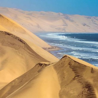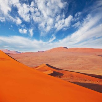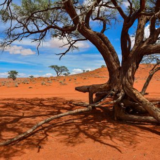 Nous vous conseillons de partir avant l’aurore pour admirer les couleurs matinales dans le désert du Namib qui comptent parmi les plus hautes dunes du monde. Découverte de Sossusvlei. Les 5 derniers kilomètres n’étant praticables qu’en 4×4 ou à pied, vous pourrez trouver sur place des 4×4 pour prendre le relais de votre voiture de location (moyennant un supplément). Profitez de votre panier-repas préparé par votre camp ou lodge pour votre petit-déjeuner dans les dunes. Puis découverte du canyon de Sesriem formé par la rivière Tsauchab, qui a creusé une gorge de 30m de profondeur. Fin de la journée libre. Nuit au camp avec petit déjeuner.