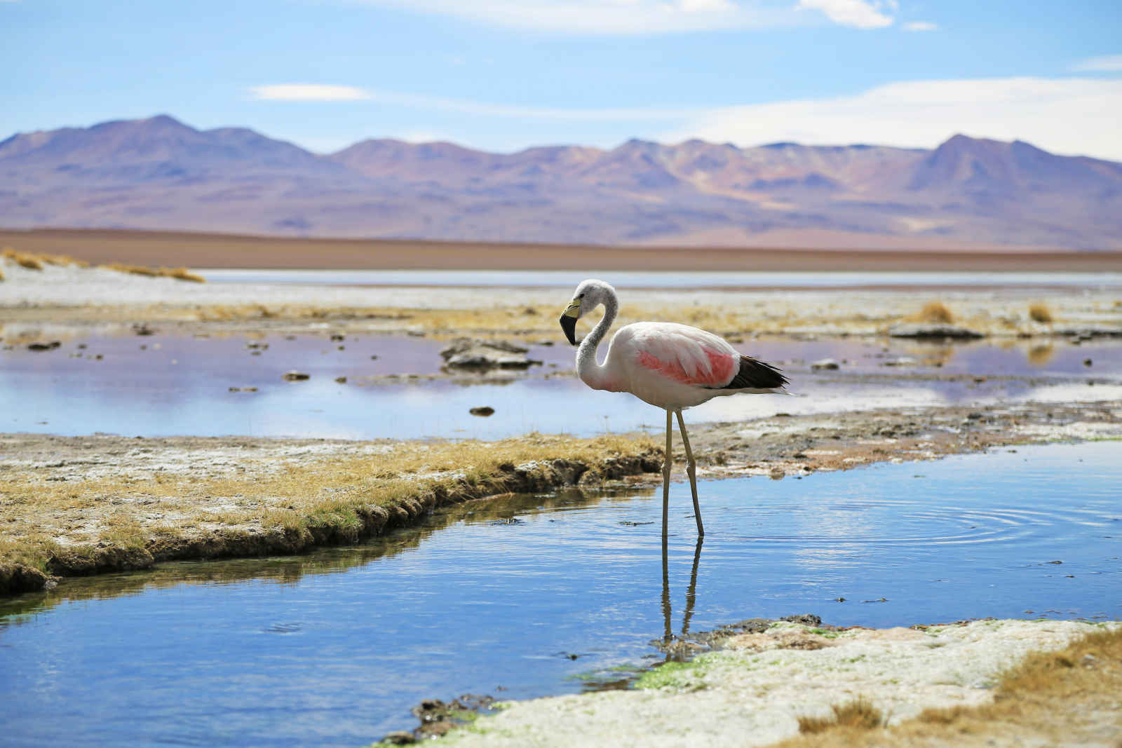 Petit déjeuner puis cap au nord en empruntant la route des Joyaux : lagunas Ramaditas, Honda, Ch’arkota, Hedionda, Cañapa, sanctuaire de 3 espèces de flamants roses. Arrêt au mirador (3 700 m alt.) du volcan Ollagüe, qui est toujours actif et qui abrite des mines de soufre. Puis descente vers le petit salar de Chiguana, dominé par le volcan Tomasil. Repas froid en cours de route. Arrivée en fin de journée à San Pedro de Quemez. Dîner et nuit à l’hôtel.