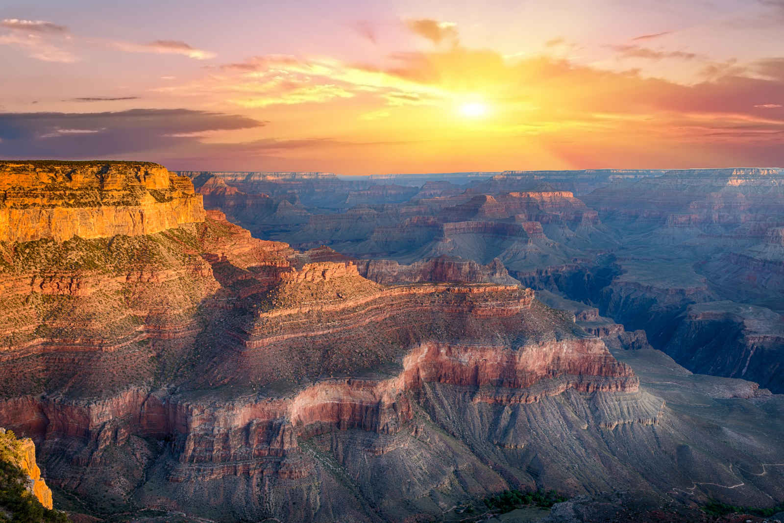En route vers l’Ouest en direction du Grand Canyon. Vous suivez la route AZ 264 qui traverse le « Painted Desert » et les trois mesas délimitant la réserve Hopi enchâssée dans le territoire Navajo. Entre Keams Canyon et Hotevilla, partant de cet axe principal, des routes secondaires non revêtues desservent plusieurs petites communautés dont certaines sont les plus anciens villages du continent nord-américain. Ils se confondent avec la terre d’argile ocre et la roche brune et ne se visitent qu’avec un guide. En parcourant cette terre sacrée des Indiens Hopis, vous vous imprégnez d’une culture millénaire que cette tribu pacifique entretient avec ferveur dans ces bourgs isolés en pleine nature au bout de pistes à peine praticables. Et si vous avez la chance d’y passer en fin de semaine, vous assisterez peut-être, au village de Shungopavi, à un spectacle étonnant de danseurs sortis de nulle part portant des masques d’animaux et offrant aux enfants les fameuses poupées « katchinas ». Continuation vers l’imposant Grand Canyon et sa rive sud dont le profond précipice apparaît soudain au bout de la route, caché derrière un rideau de pins Ponderosa. Merveille géologique reconnue parc national depuis 1919, le Grand Canyon est la plus vaste gorge fluviale du monde, ouverte sur 450 km de long et 1600 m de profondeur. Ses parois vertigineuses semblables à d’immenses cathédrales rocheuses écrasent de leur majesté le fleuve Colorado qui inlassablement effrite leurs bases.