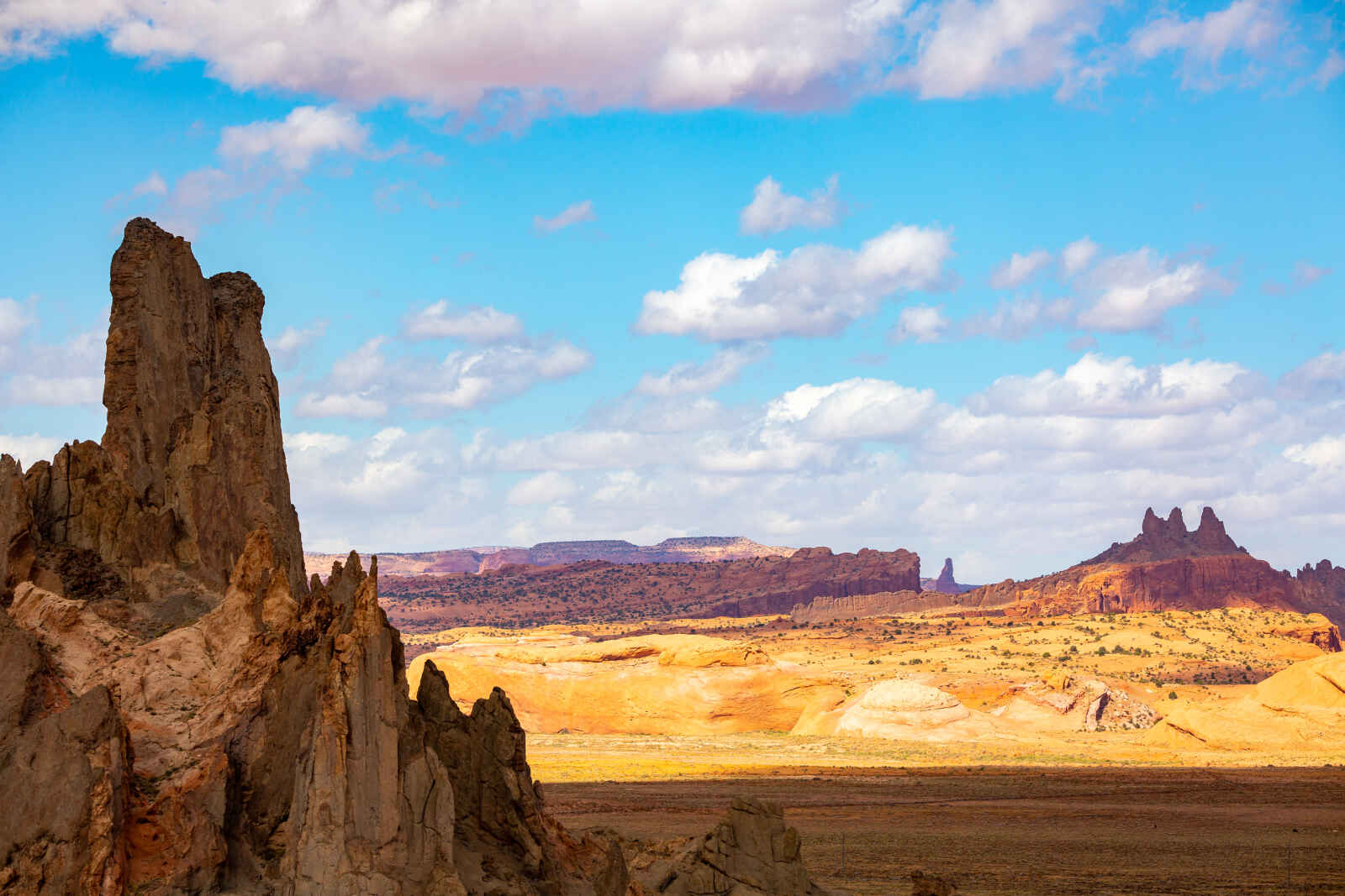 Tôt ce matin, vous empruntez avec précaution la piste qui descend et s’enfonce dans la vallée. Le parcours vous mène à plusieurs saisissants points de vue sur les buttes, mesas, aiguilles et formations rocheuses diverses. Dès les premiers tours de roue, votre regard embrasse sur votre gauche la première scène mondialement photographiée des trois buttes de West Mitten, East Mitten et Merrick, dont les silhouettes emblématiques de grès rouge semblent avoir été tranchées nettes par une lame acérée. Du groupe des « Three Sisters », fines aiguilles de grès détachées d’une immense mesa, en passant par « Camel Butte Point » dont la roche érodée figure les bosses d’un chameau, et « The Hub », dôme pétré se découpant à l’horizon, jusqu’au point de vue sur « Totem Pole » où l’érosion naturelle du grès doux de Chelly a laissé un unique et fragile pinacle dressé seul au milieu de la plaine, vous allez de merveilles en merveilles le long de ces 27km non asphaltés. Et pour finir la boucle, ne manquez pas « Artist’s Point » où vous jouirez d’un panorama fantastique sur la monumentale vallée. Vous quittez les lieux par la highway 163 qui file au sud vers Kayenta en croisant l’imposant monolithe conique « Agathla Peak », ancien bouchon volcanique créé par une puissante explosion gazeuse. Vous longez ensuite la gigantesque Black Mesa sur la route secondaire 59 qui traverse une steppe infinie et rejoint la highway 191. Prenez à gauche pour contourner le parc Canyon de Chelly et l’aborder par son entrée Nord-Est via le canyon del Muerto qui vous offrira dans la lumière douce d’une fin d’après-midi, vos premières sensations au bord des vertigineuses falaises de grès, théâtre de la résistance acharnée et désespérée des indiens Navajos au cours du XIXème siècle. Ce Monument National arborant de spectaculaires canyons, flèches et mesas de roches rouges rivalise avec n’importe quel site naturel du Southwest et il en va de même pour son héritage culturel, à découvrir accompagné d’un guide indien.