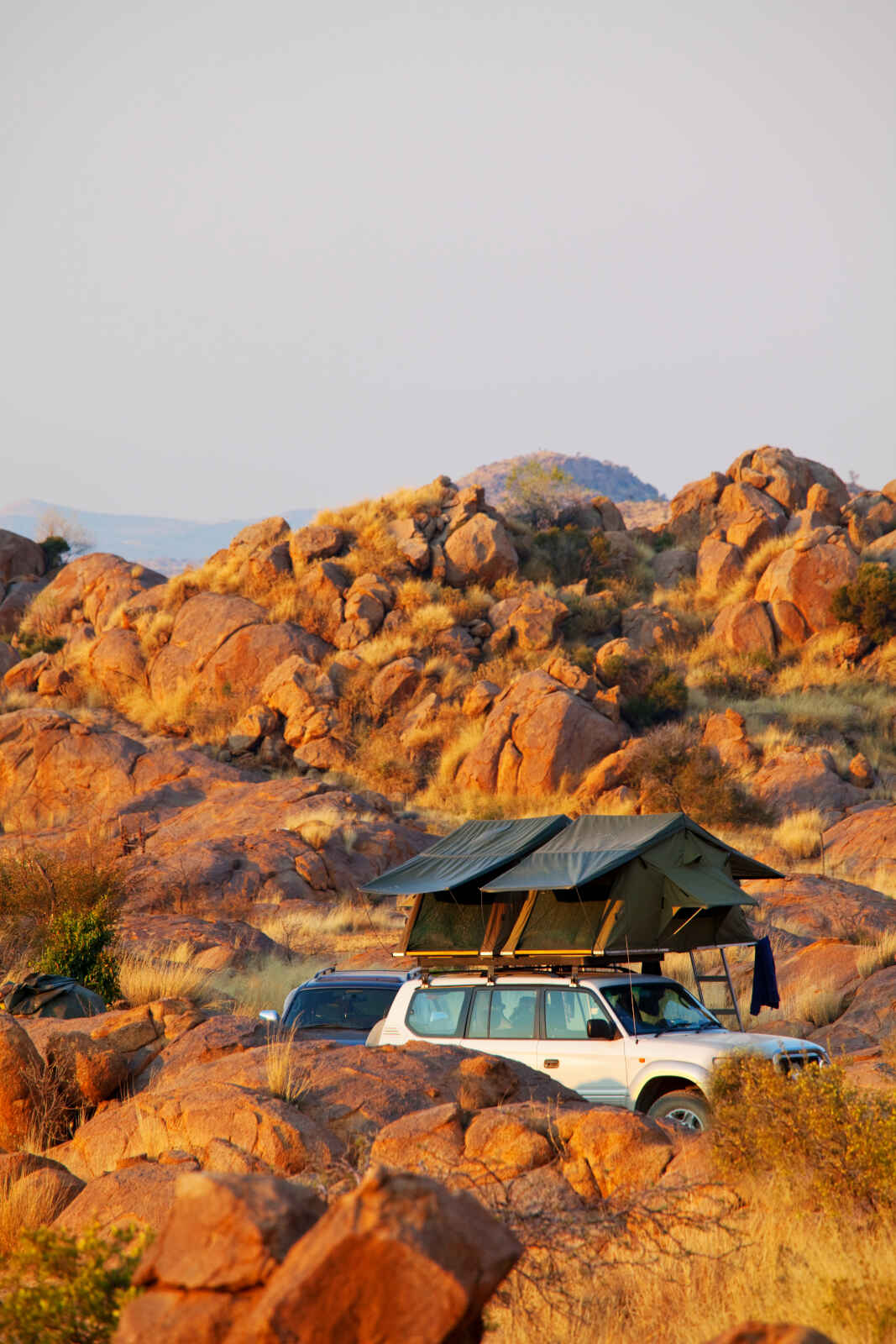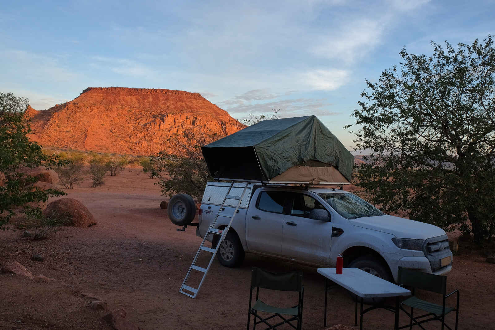La location de véhicule de Toyota Hilux double cabine 4×4 modèle avec 150 000 – 250 000 km, avec 2 roues de secours, une glacière, climatisation, radio et kilométrages illimités plus équipement de camping (1 tente sur le toit pour 2 personnes), un carnet de route et une carte de Namibie.