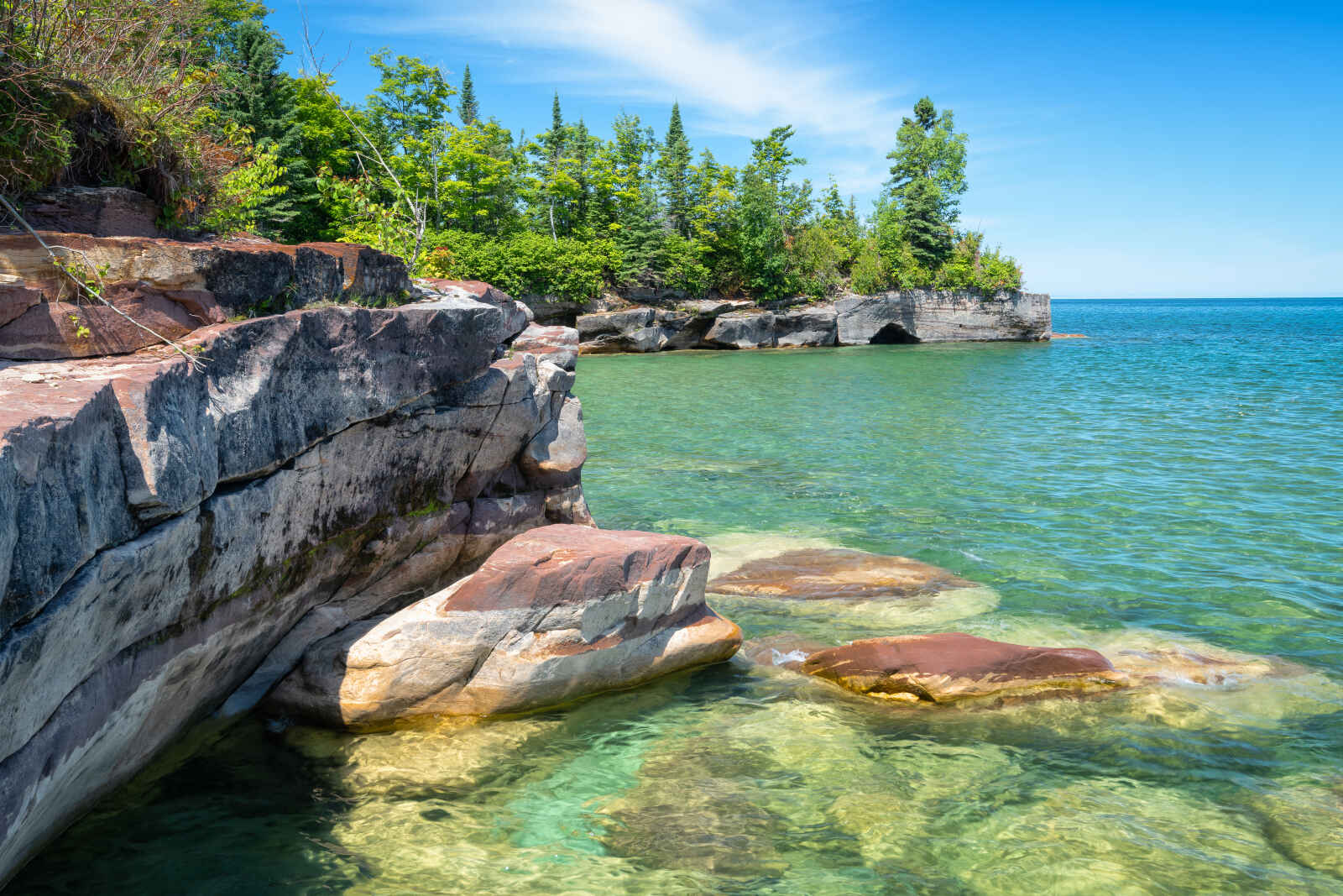 Belle et longue journée à la découverte du littoral américain de l’immense lac Supérieur. Vous entrez au Michigan et suivez de près le rivage de la « Whitefish Bay », ponctué d’antiques phares, de champs couverts de fleurs sauvages et de forêts de bouleaux blancs où se cachent en nombre les ours noirs et les cerfs de Virginie. L’itinéraire croise régulièrement des plages immaculées et baignées par une eau turquoise très attirante. Mais l’air frais et pur qui souffle du large, vous rappelle que le lac Supérieur est le plus froid des Grands Lacs et ne se réchauffe rarement à plus de 15 degrés. Vous pousserez jusqu’à « Whitefish Point », où un vieux phare guide les bateaux à travers la baie depuis 1849. Vous quittez un temps le littoral et pénétrez dans le très joli parc d’état de Tahquamenon, abritant de hautes et larges cascades de couleur brune dû au tanin des cèdres, épicéas et sapins qui teintent l’eau en amont. Vous rejoignez ensuite les berges du lac Supérieur en suivant au nord la route secondaire 77 qui vous mène à la petite communauté de Grand Marais, porte d’entrée Est du fabuleux « Pictured Rocks National Lakeshore ». Vous commencez votre exploration sur la route 58 qui parcourt le parc jusqu’à Munising et dessert plusieurs points de vue remarquables sur le lac.