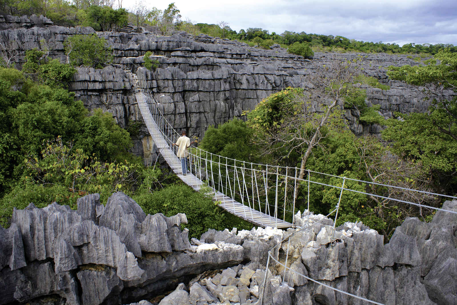 Balade à travers les toits des tsingy et les galleries de forêt. La randonnée dans les tsingy présente quelques particularités techniques. Alternant passage sur les toits des tsingy, descente dans les canyons, passage dans les galeries et éventuellement visites de grottes, tous les circuits dans les Tsingy sont aménagés : via ferrata, échelle, pont suspendu, marquage au sol… Après le déjeuner, départ pour Ambanja pour arriver en fin d’après-midi. Dîner et nuit à la Plantation Millot.