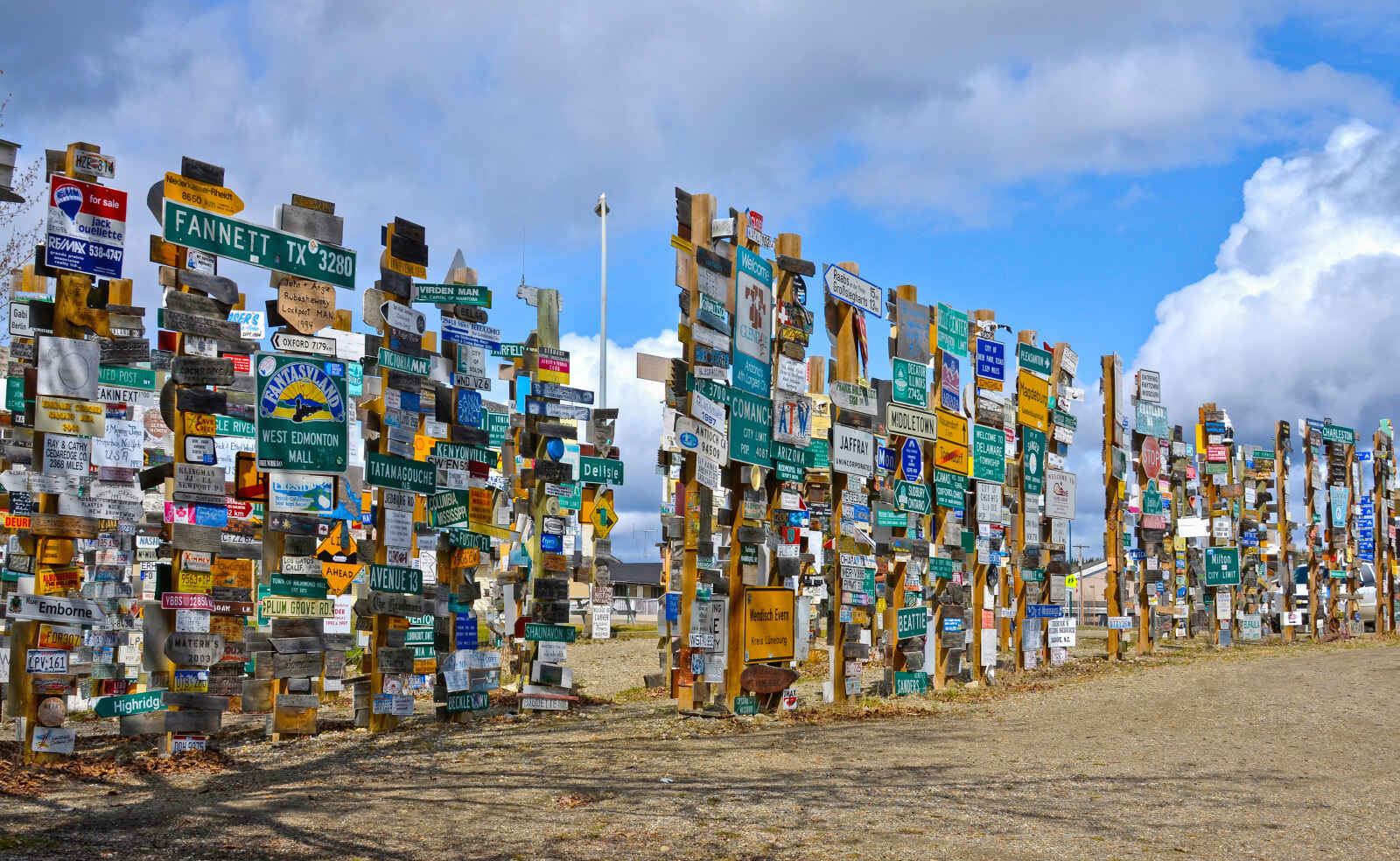 Vous quittez les rives enchantées du lac Marsh et poursuivez votre route à travers l’immensité naturelle du Yukon. Vous suivez l’« Alaska Highway », qui déroule indéfiniment son long ruban d’asphalte vers l’est en direction de Watson Lake. Des paysages grandioses défilent sans cesse devant vous sur cette autoroute déserte, où vous croisez plus de lacs et de rivières que de véhicules. A Teslin, posé sur la rive du lac éponyme, le superbe « Teslin Tlingit Heritage Centre » vous accueille et vous offre une captivante immersion dans la culture ancestrale du peuple Tlingit. Un peu plus loin, ne manquez pas non plus le musée George Johnston, qui expose les photographies mais aussi les objets et artefacts traditionnels du vénérable ainé Tlingit George Johnston, trappeur, marchand de fourrures, entrepreneur et photographe à ses heures perdues. Vous laissez Teslin derrière vous en traversant le pont sur la rivière Nisutlin et pénétrez plus profondément dans les terres sur la Highway 1, qui serpente sur la frontière entre le Yukon et la Colombie Britannique, se joue du relief tourmenté et coupe en une infinie ligne droite des kilomètres de plaines boisées, jusqu’à Watson Lake.