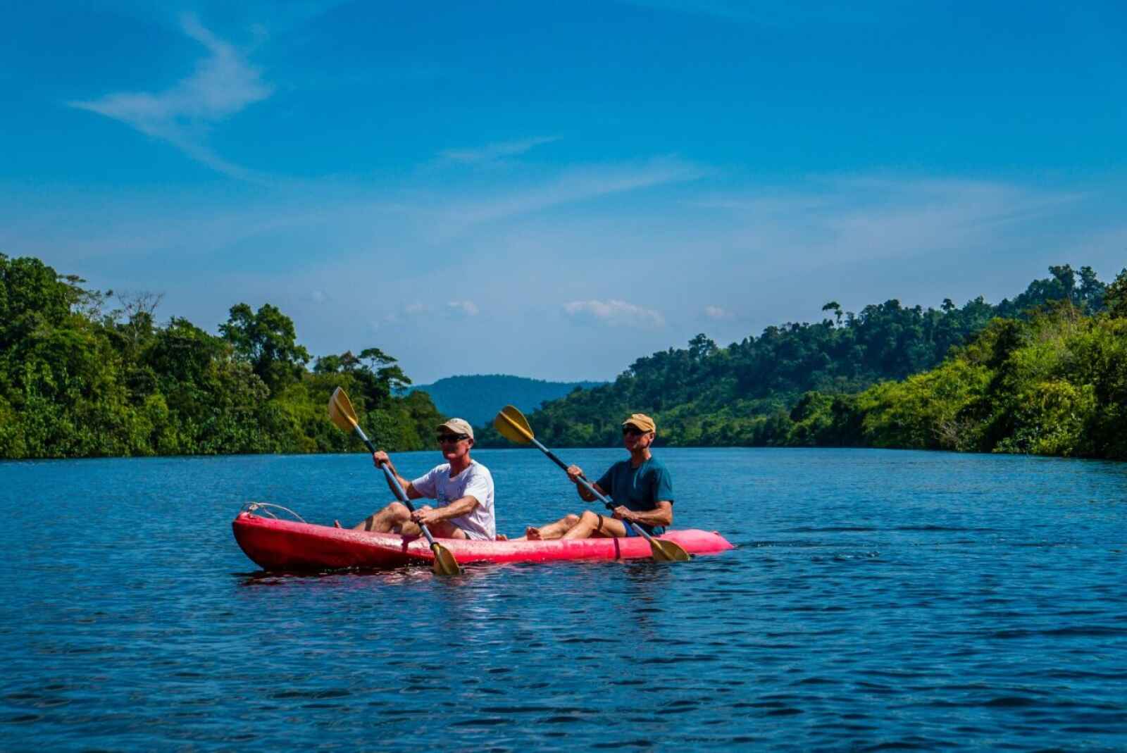 -Explorez Koh Kong et faites une croisière dans les mangroves pour découvrir un aperçu de la vie des communautés de pêcheurs qui vivent d’une abondance naturelle sous l’eau (en regroupé). Partant vers 10 heures, selon la marée, notre croisière nous emmène dans un village de pêcheurs et nous pouvons observer en chemin une faune abondante comme les calaos et les marins-pêcheurs. Nous passons un peu de temps avec les sympathiques habitants du village de pêcheurs pour nous imprégner de leur mode de vie. Nous visitons ensuite une pagode, une école locale et sommes accueillis dans quelques maisons locales. Un déjeuner barbecue est servi sur la plage avant le retour au lodge.