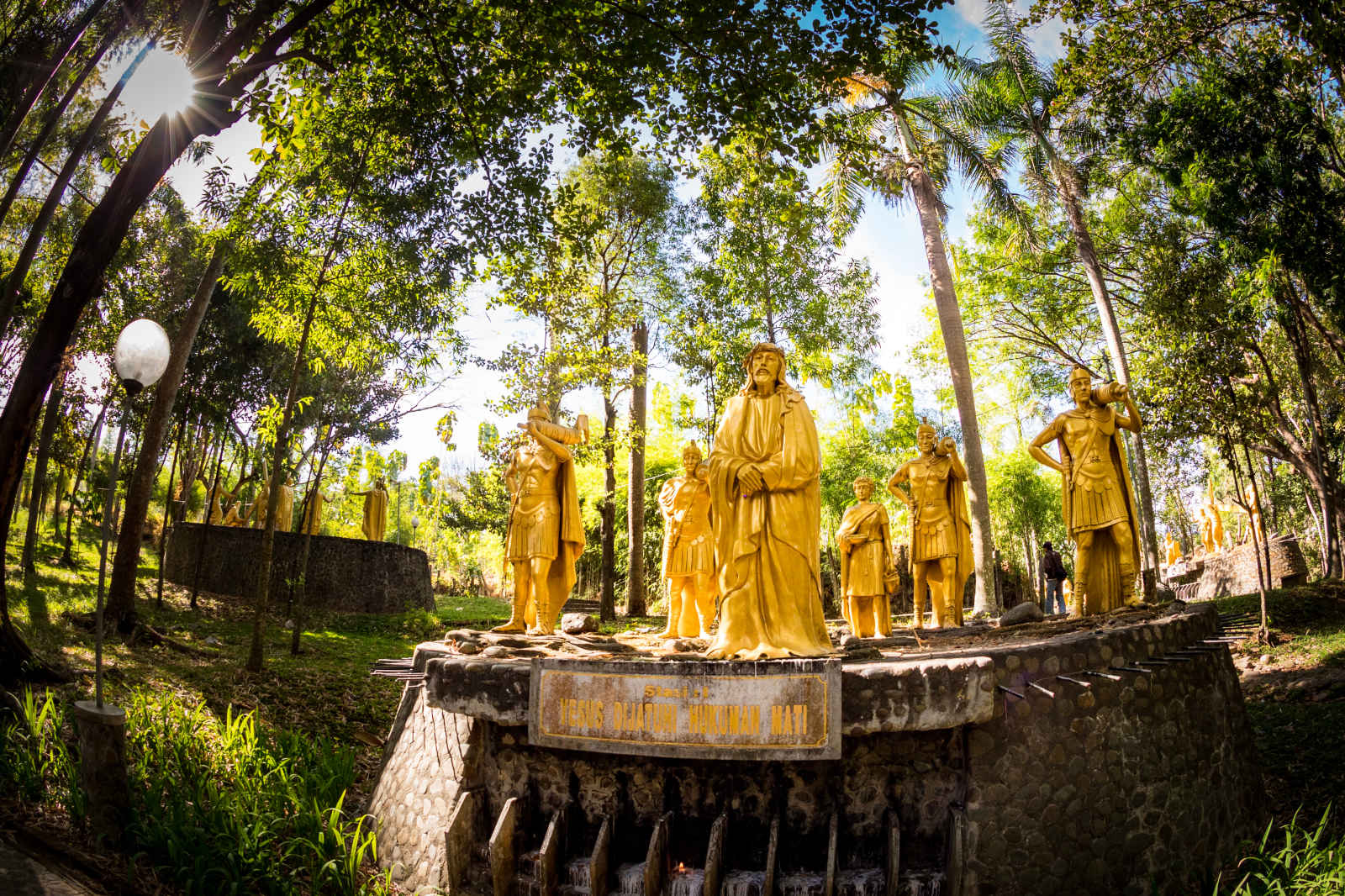 Une autre source d’étonnement ce matin… La religion catholique vécut à Java un grand élan à partir de la fin de 19e siècle, du fait des missionnaires du Brabant. Nombreux furent alors les phénomènes d’inculturation pour faire accepter la nouvelle foi aux populations locales. Un très bel exemple se trouve à Puh Sarang où une église offre ses statues dans le style hindou – tout en présentant une copie de la grotte de Lourdes – alors que le Chemin de Croix s’échappe au milieu des rizières en terrasses…